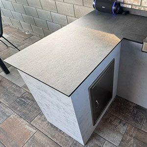 Zde je ukázka venkovní kuchyně v dekoru Fundermax Exterior 0428 NN/NW Cave. Venkovní kuchyně má otvory na dřez, gril, obsahovala několik rohových spojů a lišty.